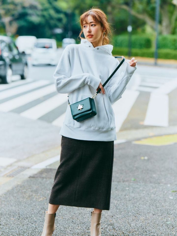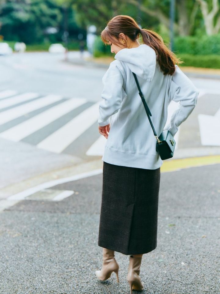 トレンドの半端丈スカートに合わせやすい、絶妙なサイズ感。おしりがちょうど隠れる丈なので、腰まわりが気になる人には体型カバー効果も。フーディ¥34,000(エイトン/エイトン青山)スカート¥17,000(アンクレイヴ/オンワード樫山)バッグ¥15,400(ADINA MUSE/ADINA MUSE SHIBUYA)ブーツ¥25,000(ダイアナ/ダイアナ 銀座本店)