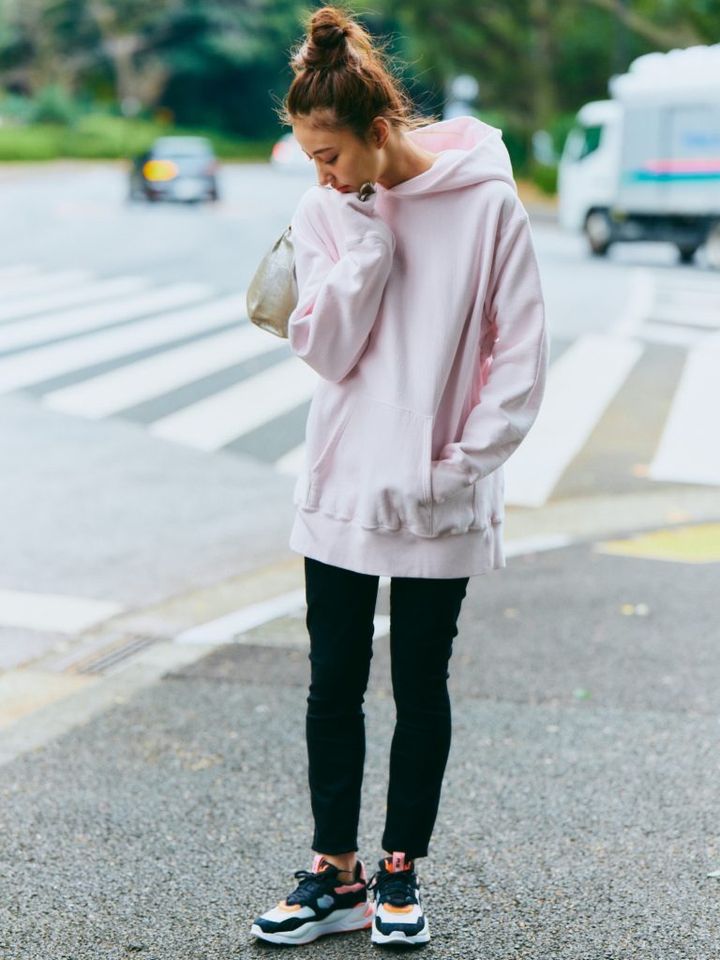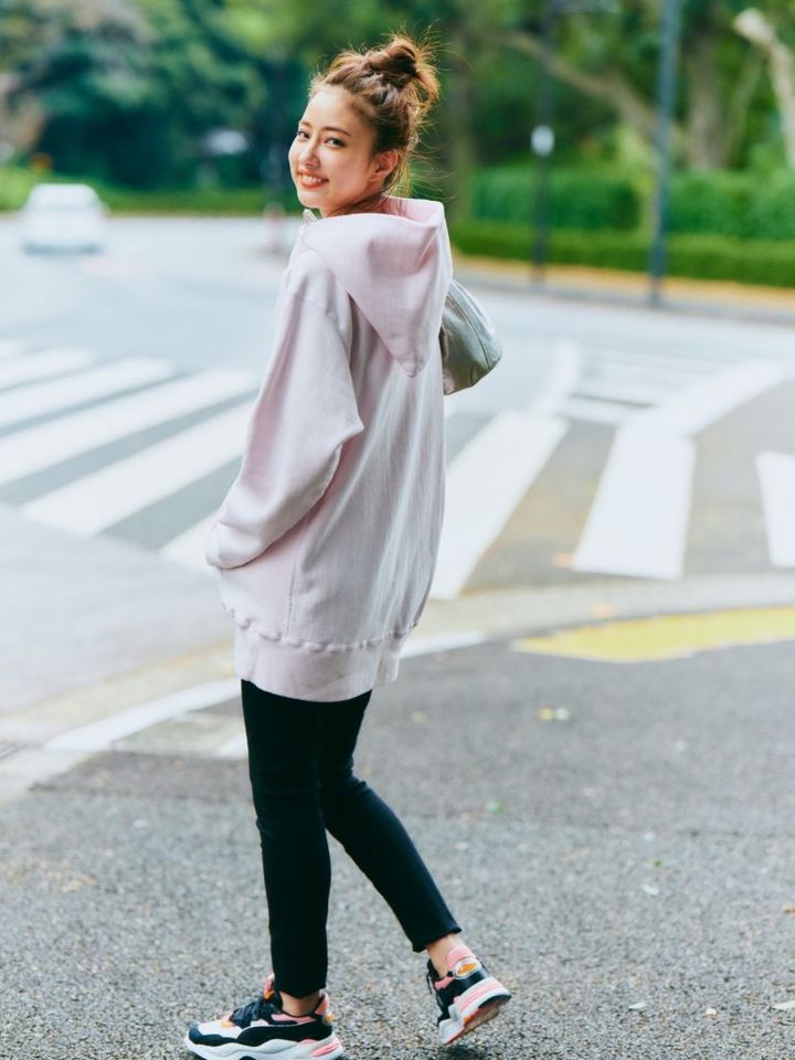 辛口モード派は、ワンピ未満の超ビッグシルエットにぜひトライして。黒スキニーとインパクトのあるダッドスニーカーを合わせれば、カッコいい旬のスポーティコーデに。ピンクもスタイリッシュに着こなせます。