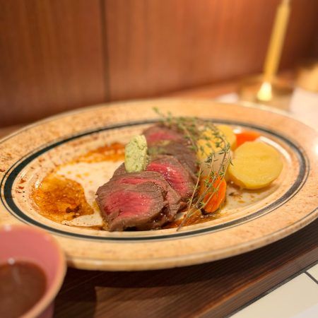 メインは、「赤城黒毛和牛のステーキハーフポンド」(3828円)がおすすめ♪旨みの強いヘルシー赤身肉を使用していて、ジューシーで食べ応えがあります。