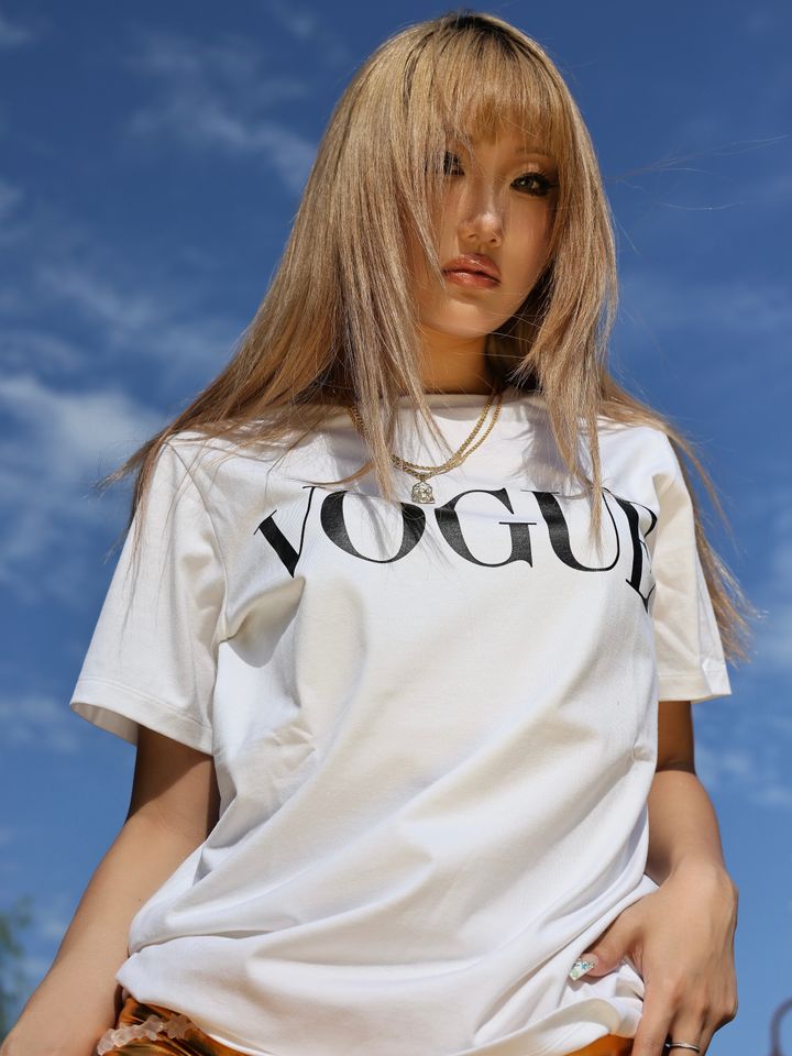 先日の「VOGUE Collection」着こなし記事では、ヘルシーな肌見せで作るY2Kスタイルを紹介してくれたモデルのPinky。今回もFINAL FANTASY XIV × VOGUE JAPAN Tシャツのホワイトを着てひと味違うスタイリングを披露。