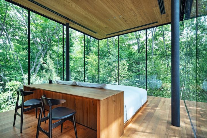 寝室はマスターベッドルームとゲストベッドルームの2部屋。どちらもガラス窓の壁面のため、森林浴をしながら過ごしている感覚になります。プライベートな空間を保ちたい時は電動でブラインドが降りてくるので気分に合わせて空間を変えられます。