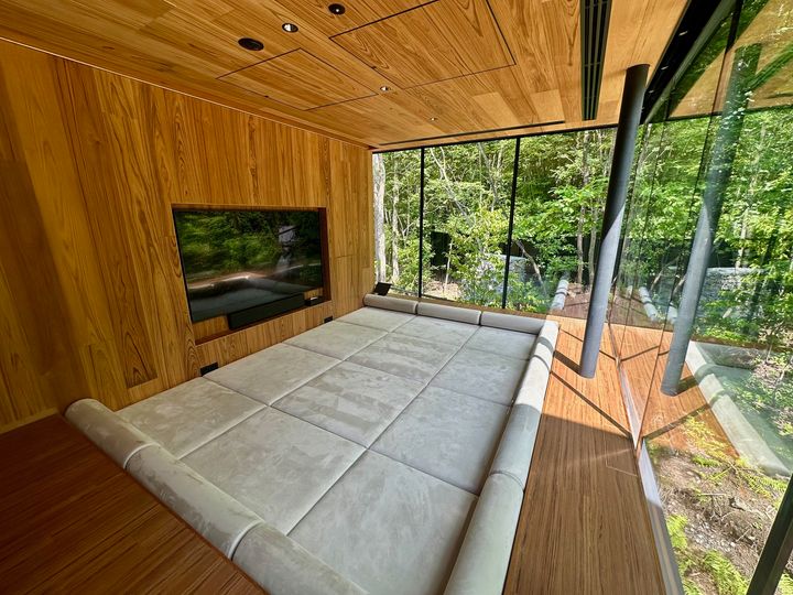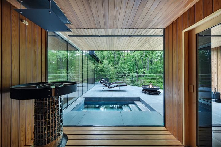 建物の1階エントランスから2階へ上がると、目に飛び込んでくるのは、ガラス窓の壁に囲まれた圧巻のリビング。ガラスの向こうにある木々が風にそよぐ音が聞こえてきそうなほど森の中に溶け込んでいます。周囲の目を気にする必要はなく、思う存分寛ぐことができます。