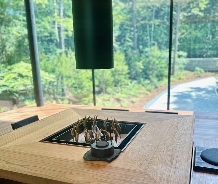 敷地内には宿泊者のみが利用できるレストラン「石朴(せきぼく)」があります。景色を眺めながら朝食やディナーを楽しめるカウンター席のみの空間で、川魚、牛肉、ジビエなど四季折々の味覚を選りすぐった囲炉裏料理を振る舞ってくれます。予約しておけば、お部屋でBBQ や鶏白湯鍋、鴨鍋を楽しむセット用意してくれる嬉しいサービスも♪