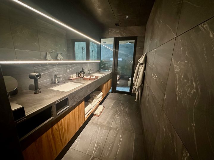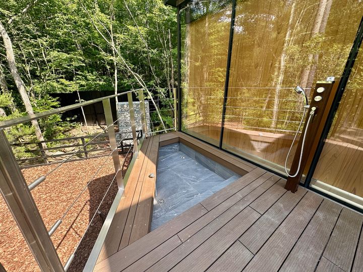 大きな岩を削り出した存在感のある岩風呂は、源泉かけ流しの天然温泉。テラスへ通じる扉を開放すれば露天風呂のようなスタイルになります。隣には仲間と入れる大きなサウナ、目の前にはプールのような水風呂と外気浴にちょうどいいチェアもあり、サウナでととのう条件も揃っています。