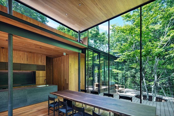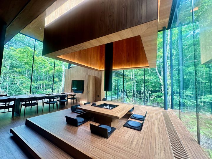 浅間山麓の大自然が広がる2万坪もの森に、隠れ家のように佇む「NOT A HOTEL KITAKARUIZAWA (ノット ア ホテル 北軽井沢)」。ファッションデザイナーの相澤陽介氏が手がけた施設「BASE(ベース)」が今春オープンしたのに続き、ガラスと木の建築が際立つ施設「IRORI (イロリ)」が誕生しました。