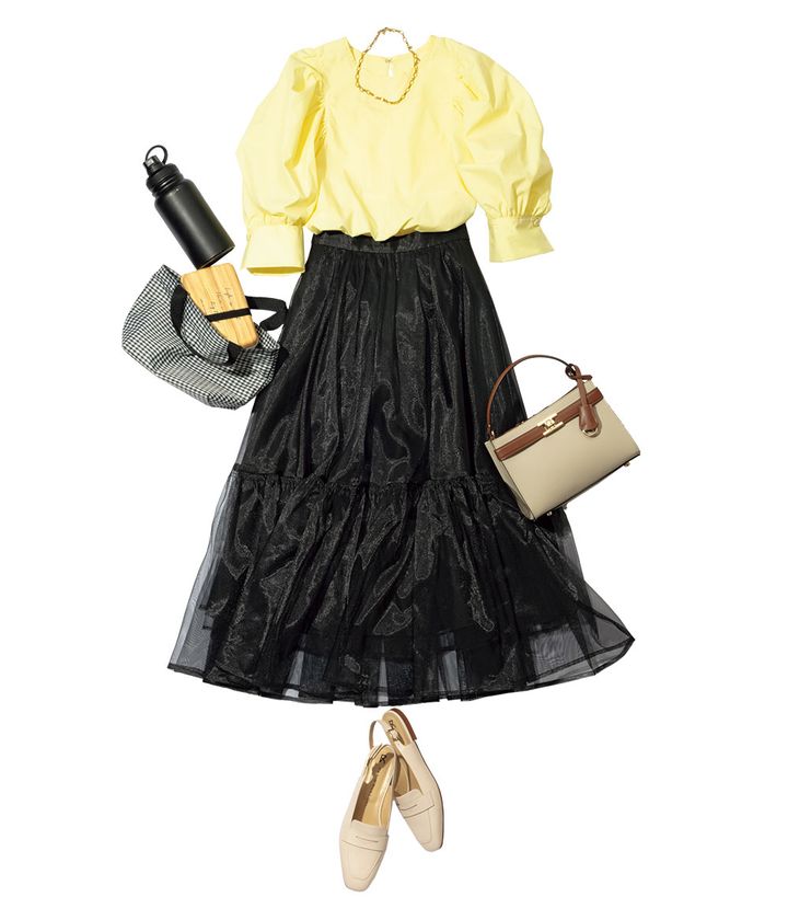 パフスリーブブラウス¥18,700(ドレステリア/ドレステリア 渋谷スクランブルスクエア店)ワークベルト付きチュールスカート¥30,800(ジャスグリッティー)キャメルバッグ¥42,900(アナイ)ローファー¥39,600(ファビオ ルスコーニ/ファビオ ルスコーニ ジェイアール名古屋タカシマヤ店)ネックレス¥9,900(ハーピー/アンタイトル)その他(スタイリスト私物)