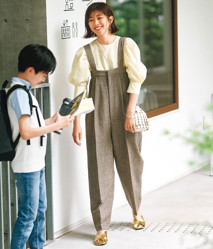 サロペットは外出直前の慌ただしさをまるっとまとめてくれる! 顔まわりを甘くして、優しげママに。