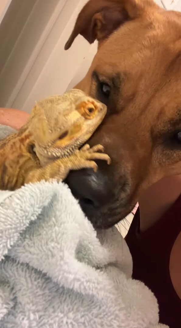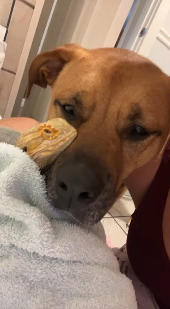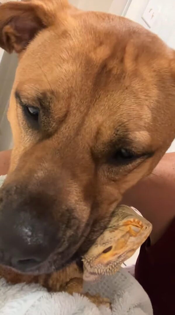3. 愛犬の親友はトカゲ?!フトアゴヒゲトカゲと顔を寄せ合う姿にほっこり【アメリカ・動画】