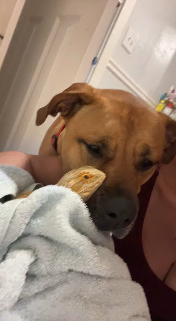 愛犬と顔を寄せ合う親友。 その相手というのは、なんとフトアゴヒゲトカゲでした!