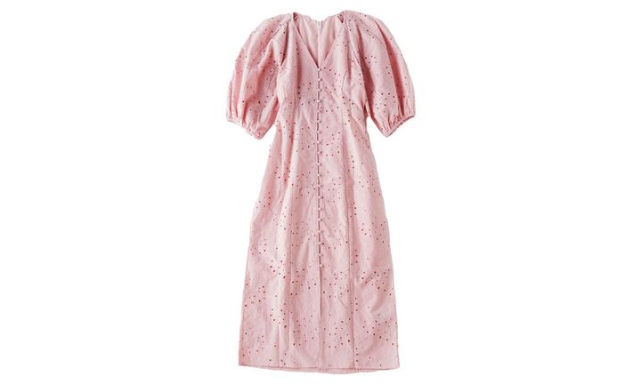 柔らかいミルキーピンク、くるみボタン、肩&袖がぽわんと丸みを帯びたワンピは、高まるキモチが形になったような、まさに恋服♡Vネックで甘くなりすぎないのも良き。