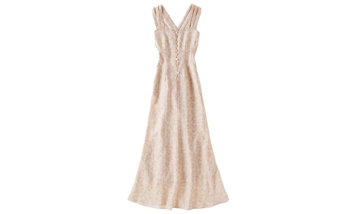 イエローベージュのマイルドなカラーとフィット&フレアなシルエットが、さりげなくアイキャッチー。 美デコルテもアピ♡