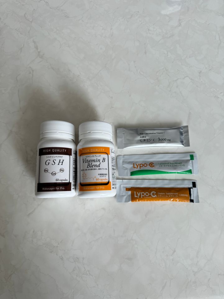 「インナーケアは、表参道の青山ヒフ科クリニックで購入しているWakasapri for Pro.の高濃度ビタミンC 3,000mgパウダー、ビタミンBブレンド、システインペプチド(GSH)のサプリメントを飲んでいます。美白はもちろん、疲労回復もしてくれるので寝る前に飲んでいて、日中にはさらに『Lypo-C』も。内側からもケアすることで、より透明感がアップしているのかなと思います。あと、風邪も引きにくくなりました!」