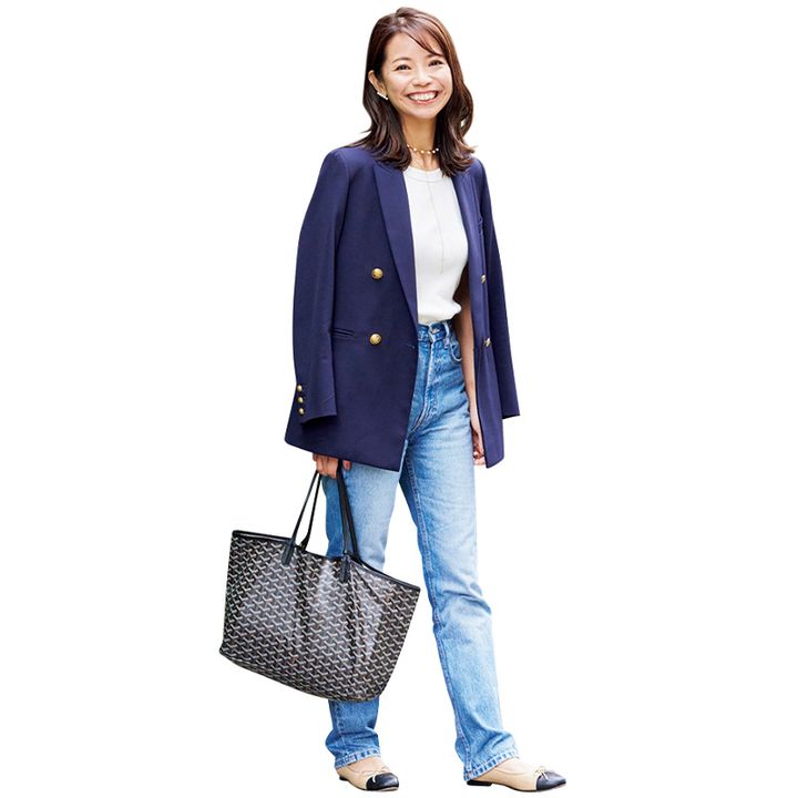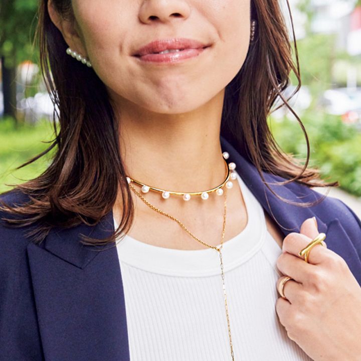 コンサバになりがちなジャケットコーデこそ、ビジュードエムのパールチョーカーが出番。normeのロングネックレスを重ねづけしてバランスを楽しんでいます。パールで品がありながらもエッジの効いたデザインがお気に入り。