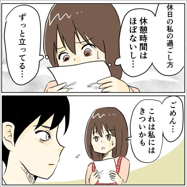 休日のカナコさんの過ごし方のスケジュールでした。起床から就寝までびっしりと予定が組まれたスケジュール。休憩時間がほぼなくずっと立っている状態でした。