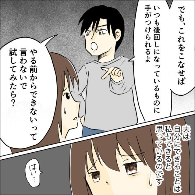 夫は自分にできることは私にもできると思っているんです。「はい。」と小さく返事をしました。確かにやる前からできないと言うのは違うかもしれない・・そうは思うものの気持ちがどんどん暗くなりました。