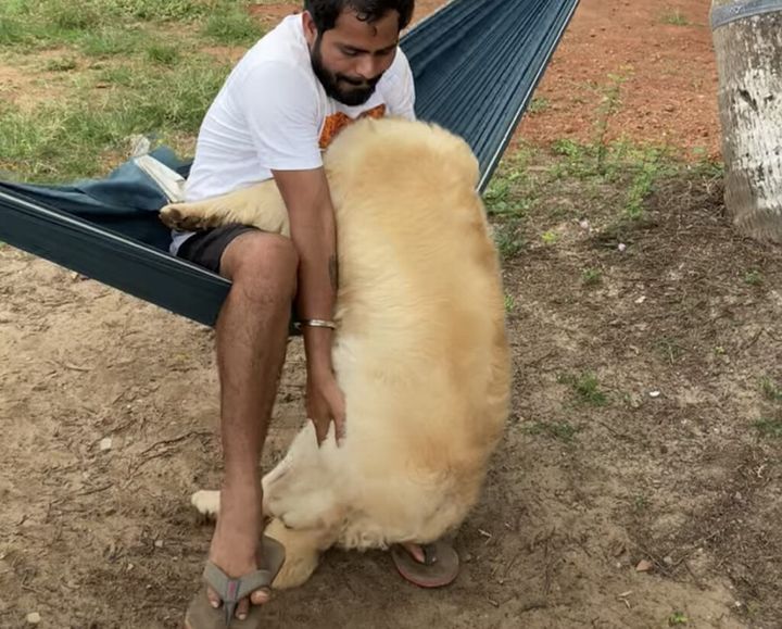 パパ、さすがに無理があるんじゃ? どーしても愛犬とハンモックに乗りたい!