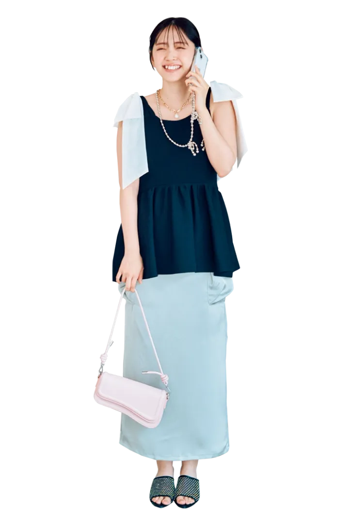 爽やかカラーのサテンカーゴスカートがコーデを涼しげに♡ 差し色にピンクバッグをチョイス!
