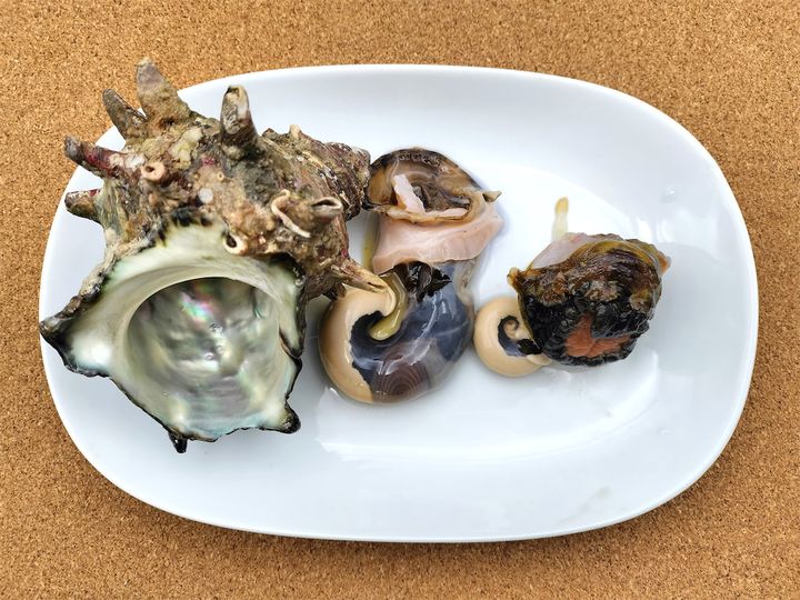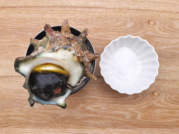 夏場の貝は特に鮮度が命ですので、まだ生きている状態のサザエを探していたところ、懇意にしている移動販売の魚屋さんがたまたま仕入れてくれました。超ラッキーな買い物ができましたよ。しかも今回入手したサザエは結構大きめで、ソフトボールくらいの大きさ。大きくても小さくてもさばく手間は一緒ですし、実は大きい方がさばきやすいのです。食べてみると身はコリコリの歯ごたえで、貝柱はそれよりも柔らかくソフトでした。茹でたワタの先端はトロっと口の中で溶け、1個のサザエから3つの食感が楽しめるのも自分でさばく醍醐味ですね。