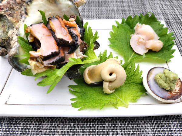 4. ワタの先端は軽く茹で、身と貝柱は20秒くらい塩もみして滑りを取って水洗いします。身と貝柱を食べやすい大きさに切り分け、器に盛りつけて出来上がりです。