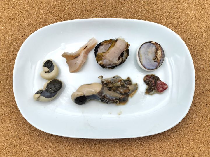 3. 身に付いているフタは包丁で外し、さらにくちばし(赤くなっている部分)を外します。ワタは先のクルクルした部分を切り取り、白い貝柱部分を外します。この中で食べられるのは左のワタの先端、上の真ん中の貝柱と身です。
