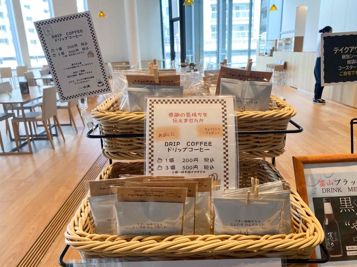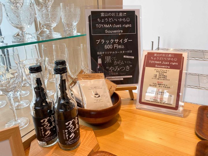 店頭では、富山名物の富山ブラックラーメンを彷彿とさせる「ブラックサイダー」、小馬オリジナルブレンドのドリップバッグなどが販売されています。ちょっとしたギフトや、富山土産にいかがでしょうか。
