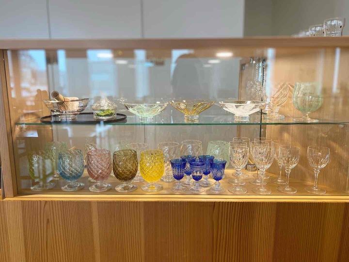 注文カウンターには、富山ガラス工房で作られた美しいグラスが並んでいるので、こちらも富山旅行の思い出にぜひ見て帰ってくださいね。