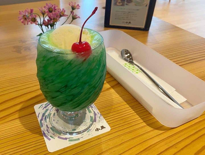 小馬 キラリ店には、看板メニューの4色のクリームソーダもあります。メロン、レモン、ブルーハワイ、いちごの中から推しカラーや気分に合ったフレーバーを選べるのが嬉しいです。