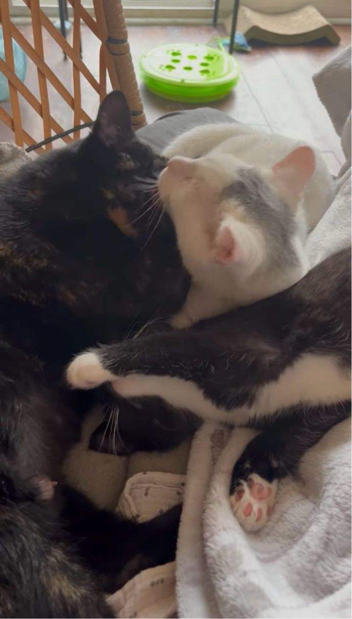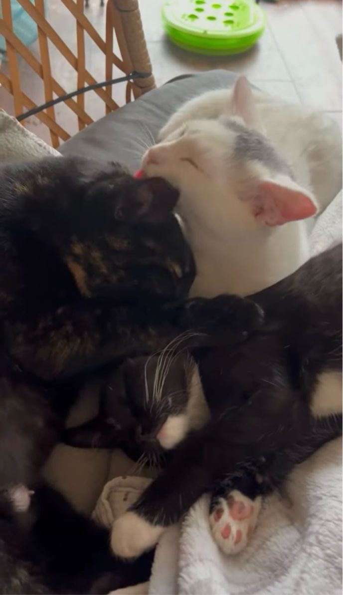 さらに、体勢を変えて白猫と黒猫の2匹がお互いのことをグルーミングし始めました。 抱き合うような体勢でせっせと毛繕いし合うその様子から、この子たちの絆の深さをうかがえますね。