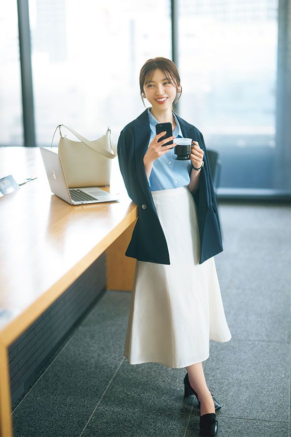 白スカートとの合わせなら、ネイビージャケットが重見えせず軽やか。サックスのシャツをのぞかせて、とことんクリーンに。