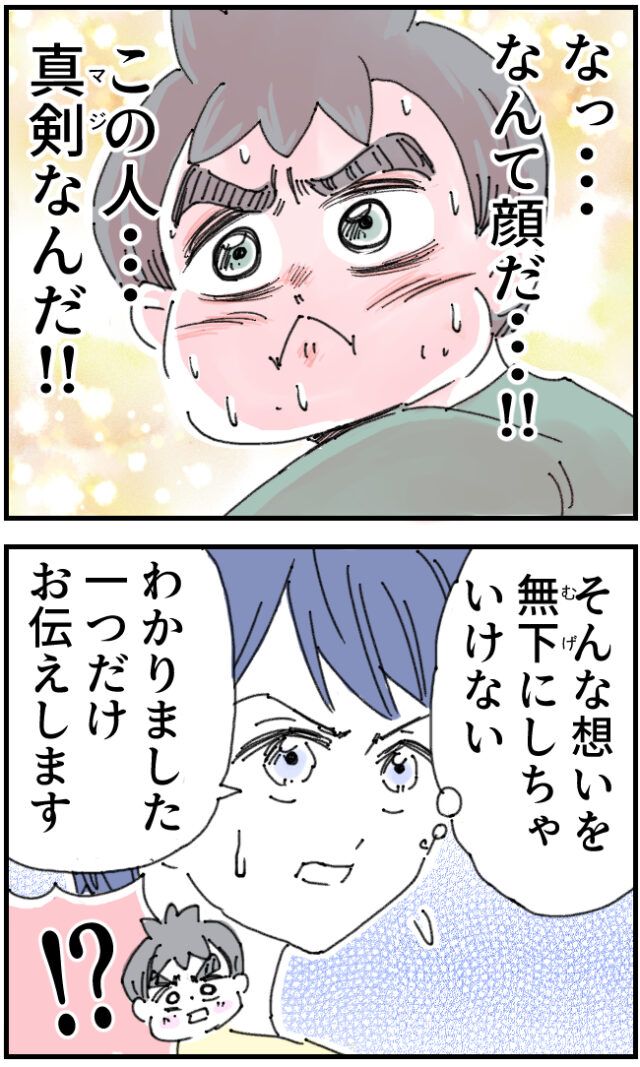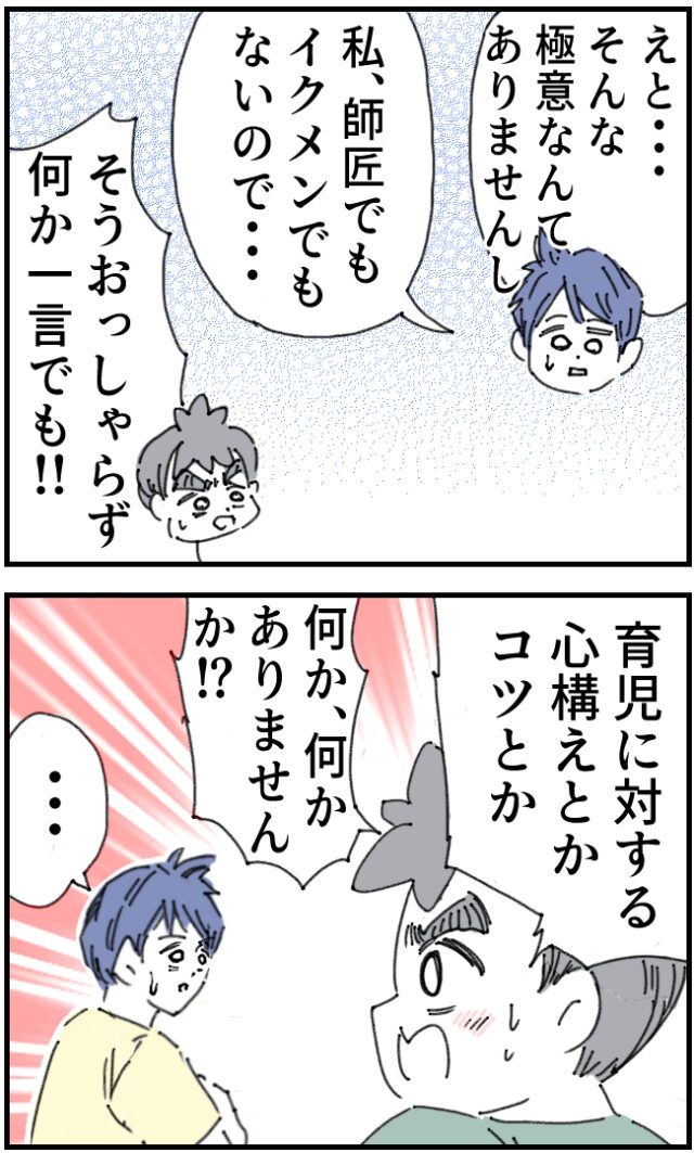 「僕にっ!イクメンの極意を教えてくださいっ!!」いちろうさんにそう言われた佐山さんは「・・はい?」突然のことで戸惑いました。すると「僕にっ!イクメンの極意を!教えてくださいっ!!」と同じことを繰り返すいちろうさんに「いや同じことを2回言われても!!」と心の中でツッコミながら「えと・・そんな極意なんてありませんし、私師匠でもイクメンでもないので・・」と謙遜する佐山さんに「そうおっしゃらず何か一言でも!!育児に対する心構えとかコツとか、何かありませんか!?」と懇願するいちろうさん、その表情を見た佐山さんは「なっ・・なんて顔だ・・!!この人・・真剣なんだ!!」といちろうさんの真剣な顔を見て「そんな想いを無下にいちゃいけない」そう思い「わかりました。一つだけお伝えします」と佐山さんは言いました。「私が子育てしながら日頃意識していること・・それは・・」佐山さんの言葉に、いちろうさんは真剣に耳を傾けました。