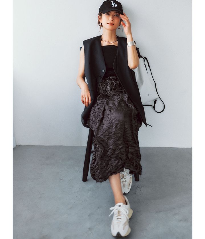 ジレ¥31,800スカート¥28,600(ともにプランクプロジェクト/プランクプロジェクト 青山店)タンクトップ¥14,300(ebure/LITTLE LEAGUE INC.)バッグ¥99,000(チャコリ × ハイク/ボウルズ)靴¥14,190(ニューバランス/ニューバランス ジャパンお客様相談室)キャップ¥4,400(ニューエラ)ピアス¥31,900(ブランイリス/ブランイリス トーキョー)ネックレス¥93,500(マリハ)バングル¥39,600(ete bijoux)