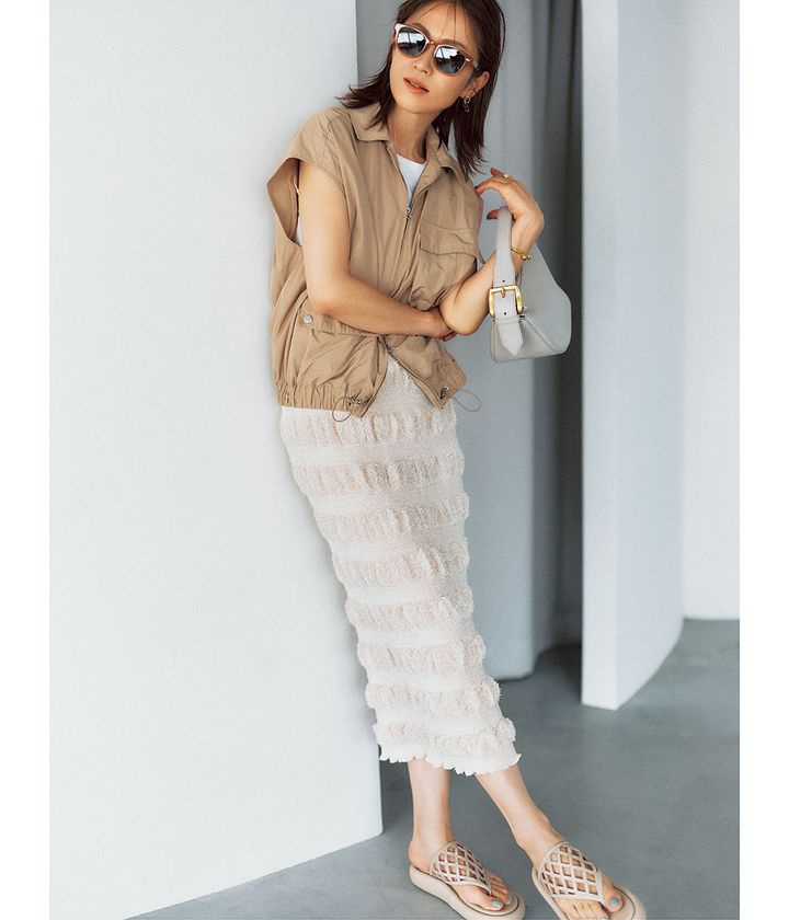 ジレ¥22,000(エミ/エミ ニュウマン新宿)Tシャツ¥8,800(アルアバイル)スカート¥20,900(メゾンスペシャル/メゾンスペシャル 青山店)バッグ¥148,500(J&M デヴィッドソン/J&M デヴィッドソン カスタマーセンター)靴¥39,600(PIPPICHIC/ベイジュ)ピアス[左耳]¥3,300(and cloud)リング¥154,000(ete bijoux)バングル¥8,800(ダブルスタンダードクロージング/フィルム)サングラス¥49,500(アイヴァン/アイヴァン 東京ギャラリー)
