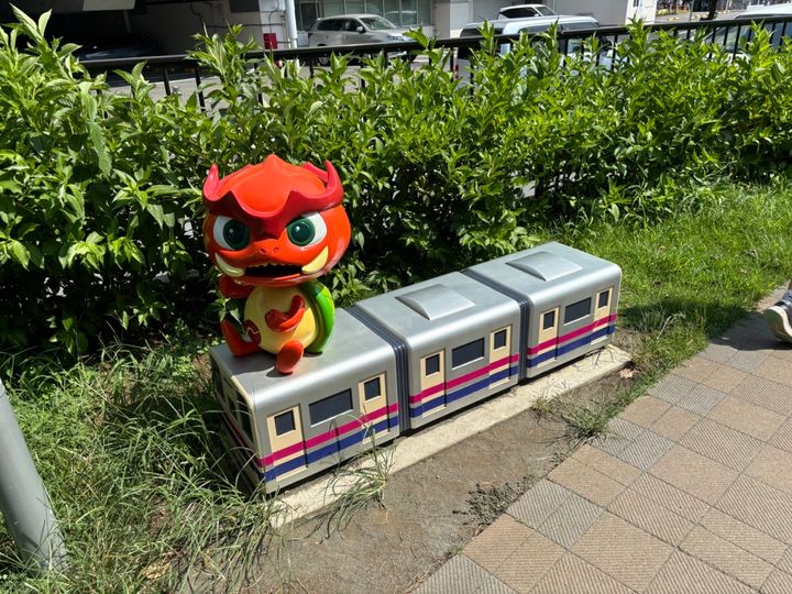 ガメラの足跡?らしきものや、ガメラをモチーフにしたキャラクター「ガチョラ」と京王線のミニチュアもあります。こちらは自由に乗って遊べます。調布市には映画関連の会社や撮影所がいくつもあり、 ガメラが撮影された「角川大映スタジオ」もあります。なのでガメラ推しなのです。
