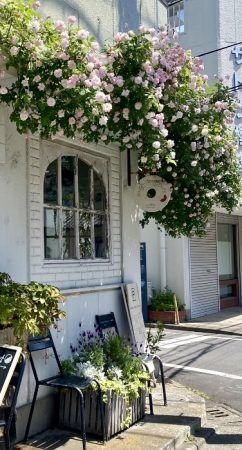 とても可愛らしいカフェ。5月には可憐なピンクのバラに包まれます。この時期からかき氷が始まります。