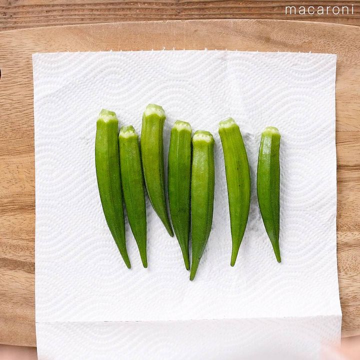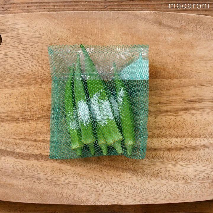 オクラに塩を振って揉み込むことで、表面の産毛を取り除き、色鮮やかに仕上がります。