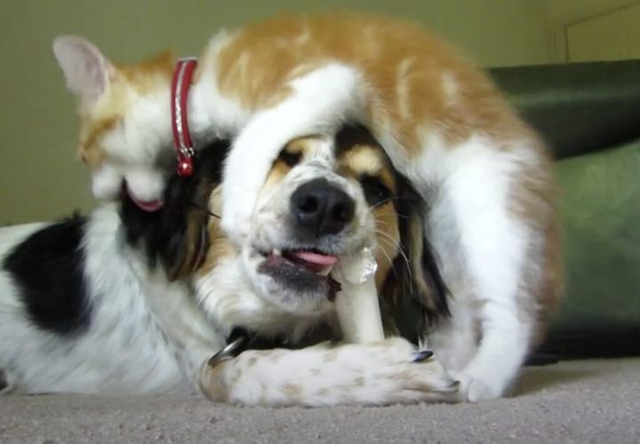 2. 犬「今、おやつタイムだから!」子猫にからまれても骨を諦めない。