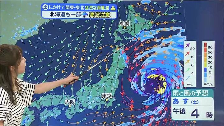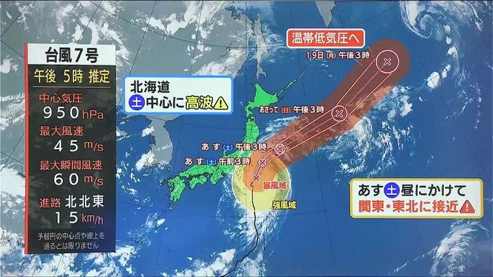 あす17日にかけて東北地方にも接近したのち、進路を東へ変えて離れていく予想です。北海道に近づくことはない見通しですが、暴風域を伴ったまま進んでいきますので、少し離れた北海道の太平洋側でも台風からのうねりが入り、今夜から高波に注意が必要です。