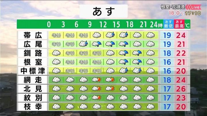太平洋側は午前を中心に霧がかかり帯広や釧路などでは午後に雨が降るでしょう。オホーツク海側は日のさす時間がありそうです。