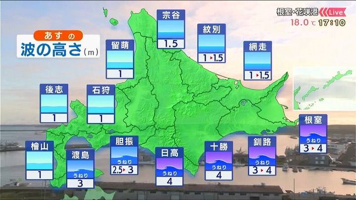 背景は16日(金)午後5時10分ごろの根室情報カメラ。根室の海域もすでにうねりを伴っていて、あすにかけてさらに波が高くなっていきそう