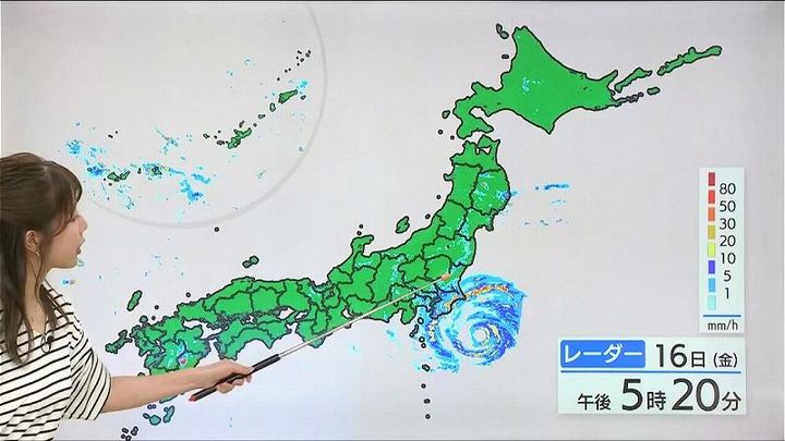 16日午後5時20分現在の雨雲の様子です。台風に伴う渦をまいた活発な雨雲が関東地方を中心にかかっています。このあと、まだ雨や風のピークが続くと考えられます。