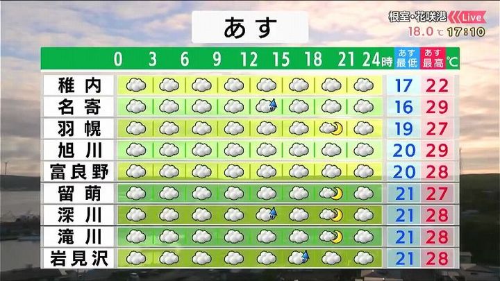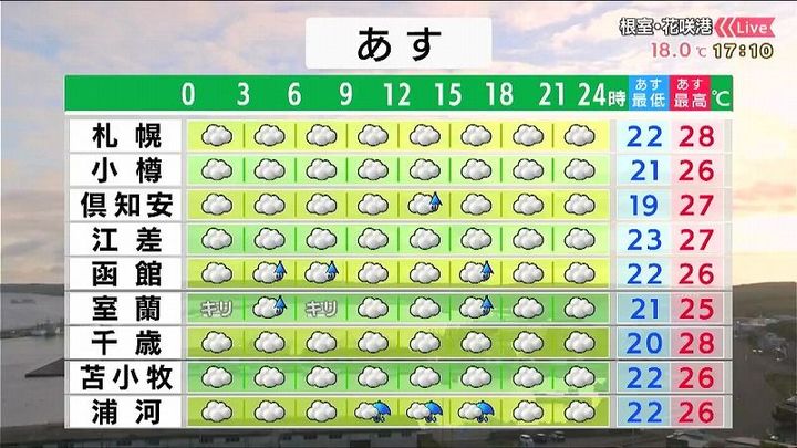 では、あす17日の時間ごとの天気。道央・道南からです。