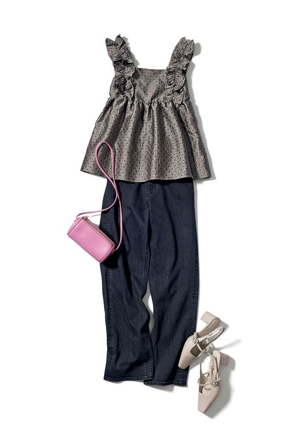 ドット柄に肩を彩る大ぶりなフリル、ふんわり裾と、フェミニン派にはたまらないディテール尽くしなのにこのプライス! 青みピ ンクのバッグで華やかな差し色も効かせつつ、ボトムはブラックデニムでハズす今年らしいバランスならシャレ感MAX!