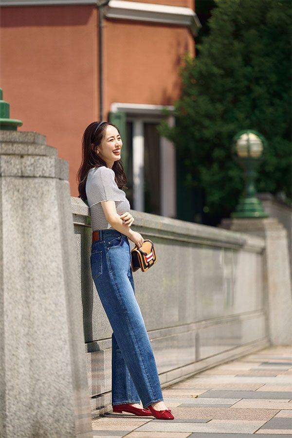 ケープ風の袖が女っぽいニットで、ボーダー柄を一枚ウワテに投入。股上深めのデニムにインしてパリライクなレディスタイルに。