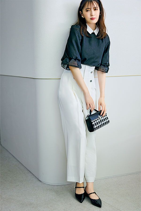 襟付きブラウス¥10,450/Noëla パンツ¥14,960/Swingle(Swingle 有楽町マルイ店) カチューシャ¥20,900/アレクサンドル ドゥ パリ(アレクサンドル ドゥ パリ GINZA SIX店) イヤリング¥3,240/アビステ バッグ¥14,300/ダイアナ(ダイアナ 銀座本店) 靴¥23,100/銀座かねまつ(銀座かねまつ6丁目本店)
