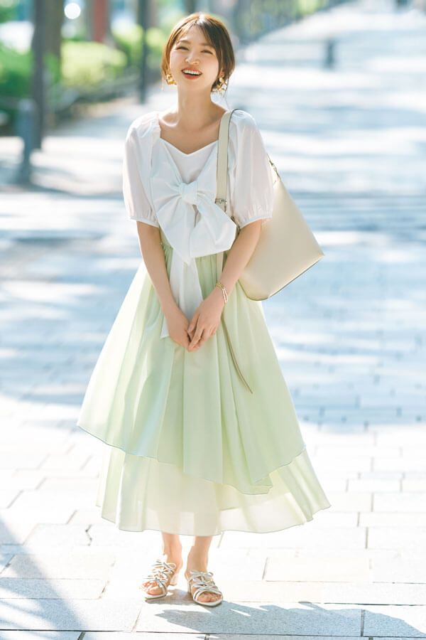 リボンブラウスにティアードスカートと甘さ全開でも、爽快な配色なら嫌味なく好感度抜群。