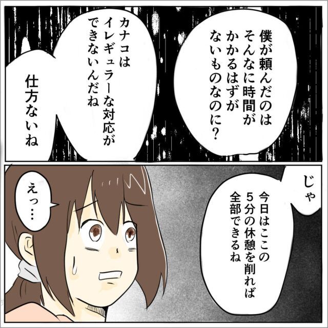 「カナコはイレギュラーな対応ができないんだね」と、呆れたように言いました。そして「じゃ、今日はここの5分の休憩を削れば全部できるね。」と当然のように言われてしまいました。