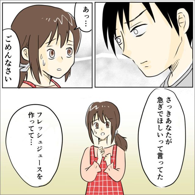 「あっごめんなさい。さっきあなたが急ぎでほしいって言ってたフレッシュジュースを作ってて・・・」急に作るように言われたフレッシュジュース。夫の望むのはいつも手作りのフレッシュジュースなので、時間がかかりました。