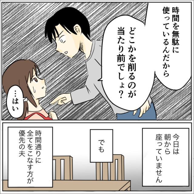 夫のスケジュール通りに必死に家事をこなそうとしている私は、朝から座る時間などありません。でも夫は時間通りに全てをこなす方が優先です。