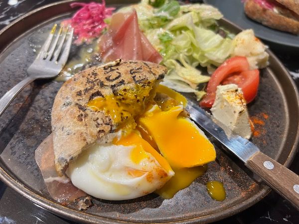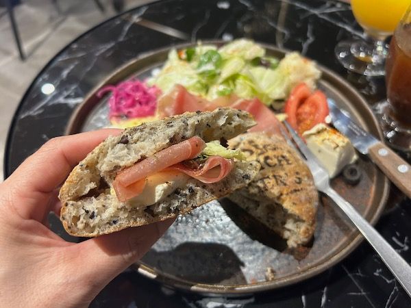 私は、半熟卵に生ハム、お野菜などを乗せてオープンサンドスタイルでフォークとナイフでいただきました。外側はカリッとしてるのに、中はふわふわ!!食べる直前に具材を乗せるので、水分でべちゃっとなることもなく、焼きたてのパンの美味しさそのままでサンドウィッチが楽しめました♪