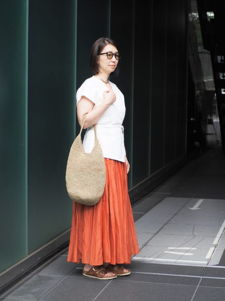「清潔感のある着こなしを意識してコーディネートを組むようにしています」と話すYさん。トップスは、顔まわりをパッと明るく見せる白を選んだのだとか。「『ZARA』のリネンベストは前を開けてジレっぽく着ることもでき、これひとつで着こなしの幅が広がります。シフォンスカートは下半身がボリューミーになるので、リボンでウエストマークをしてメリハリをつけてみました」